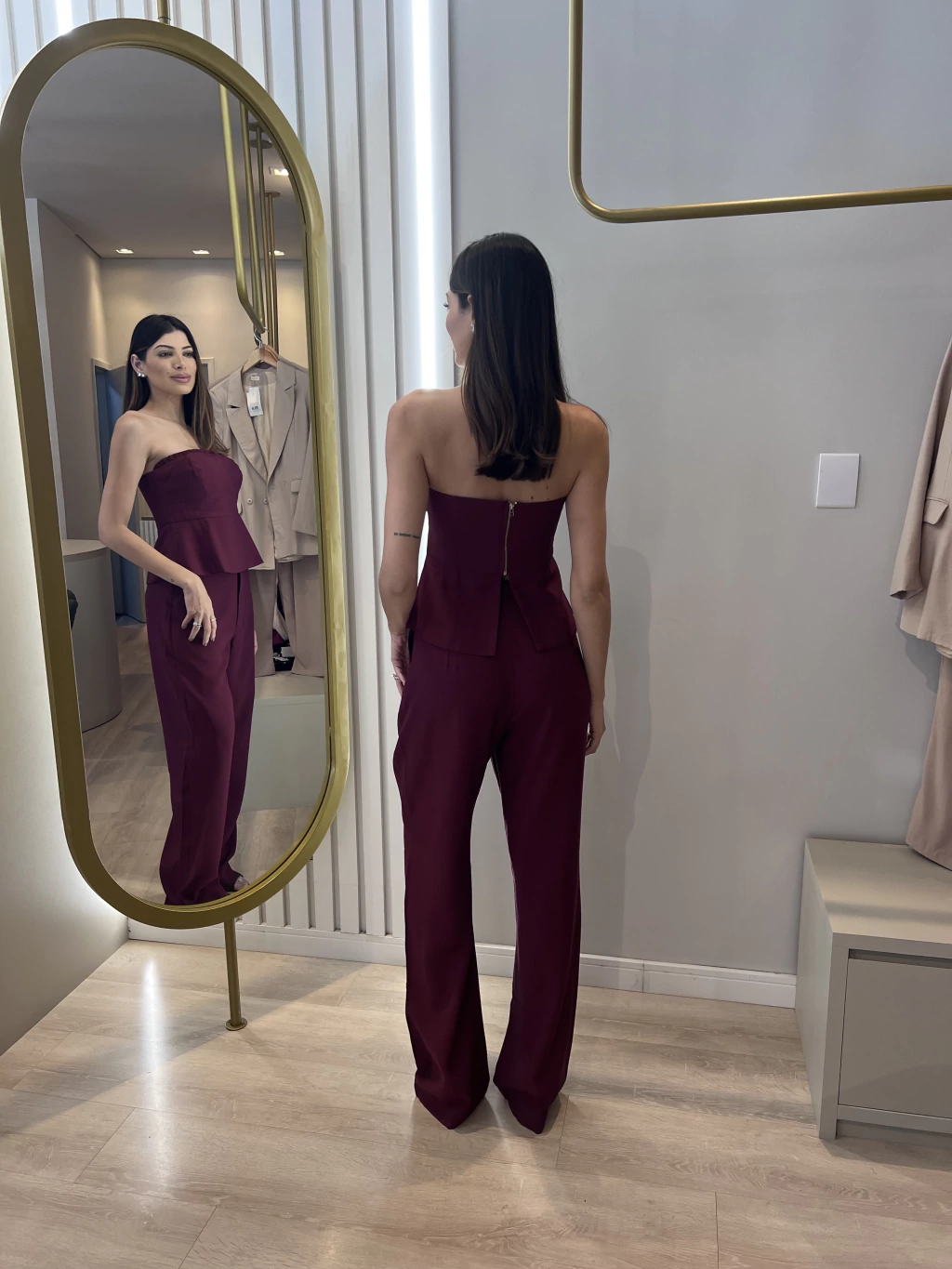cumprimenro da calça ótimo para quem é alta pois não é curto, top tomara que caia com zíper tratorado na parte de trás reforçado que dá mais segurança.